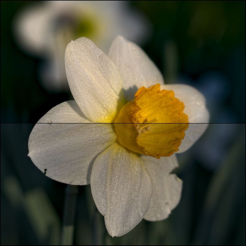 ウェーブレットのレベルを使って行った処理、下半分が処理前、上半分が処理後の画像